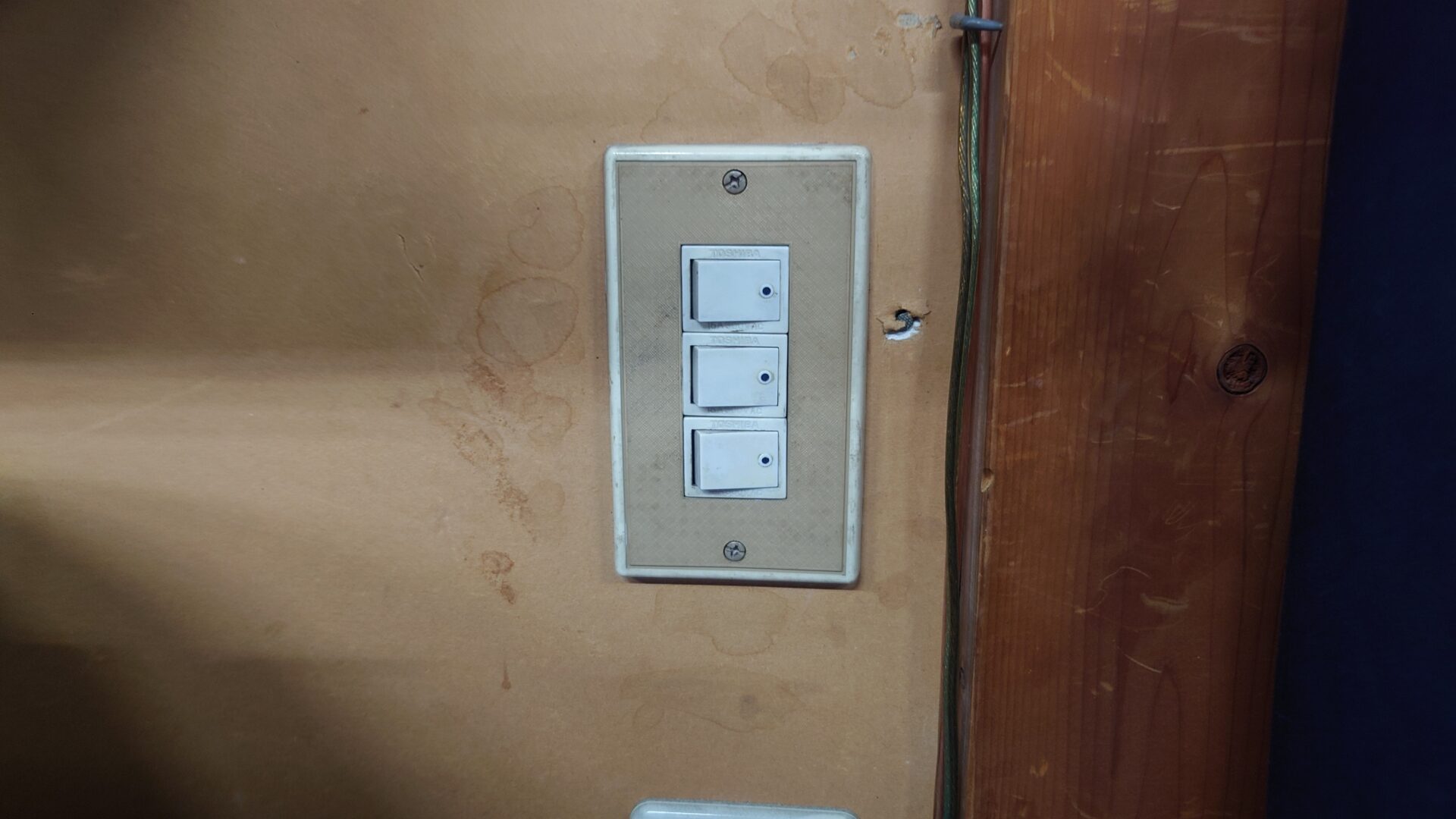 元々3つあった照明を個別に点灯させたかったのかスイッチも3連のものだったのですが、自分がこの空間を使い始めてから個別点灯する事がほぼ無いことと、夜暗い中手探りでスイッチを探す手間を省きたくてほたるスイッチのシングルに交換しました。
