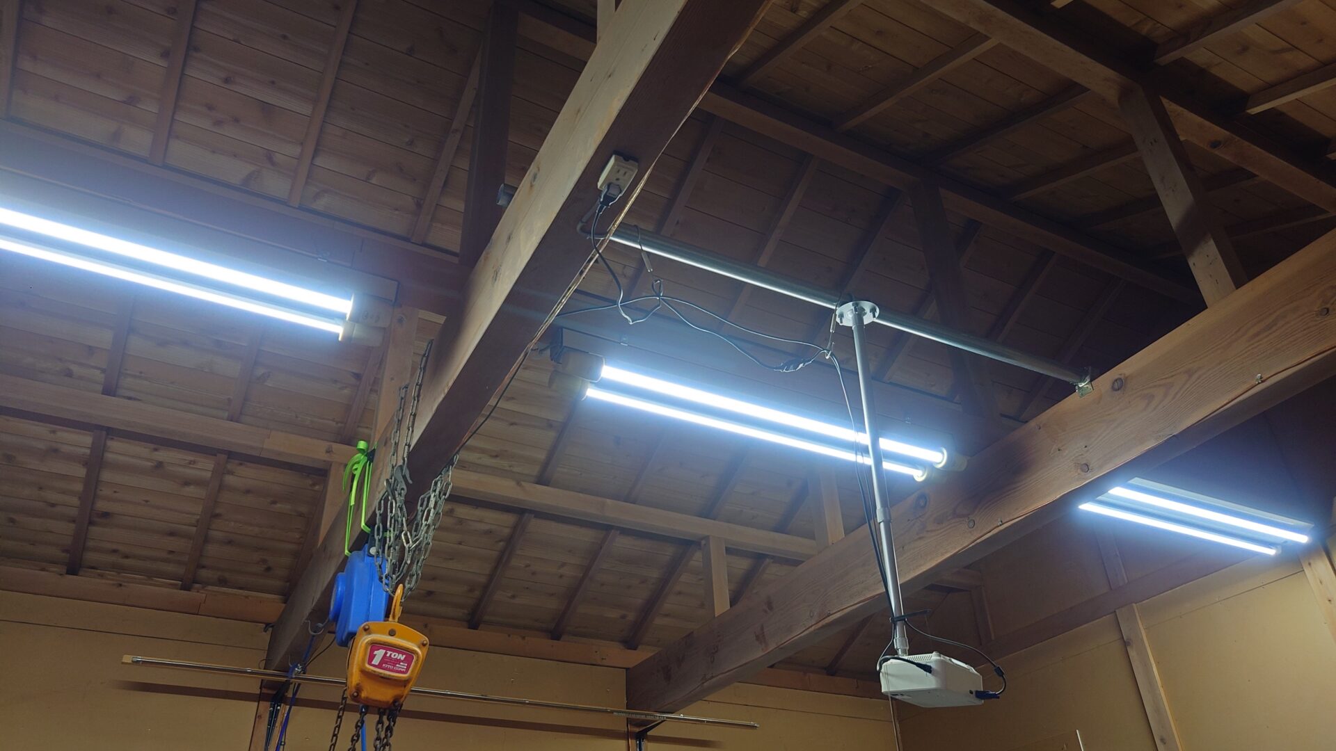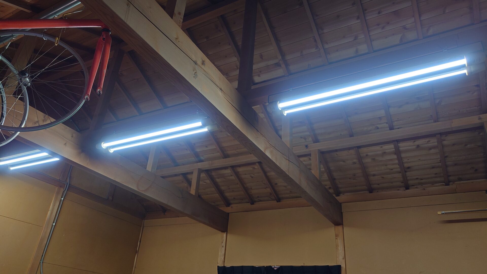 ガレージの照明は、もともと蛍光灯が3つ(真ん中と両端)ありましたが間にひとつずつ追加して5箇所にし、更にLED化もしています。