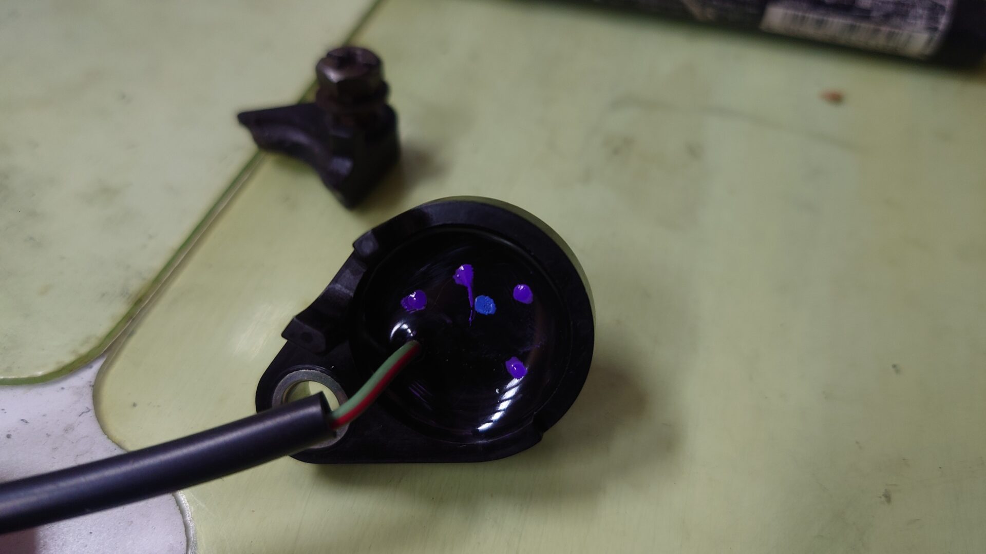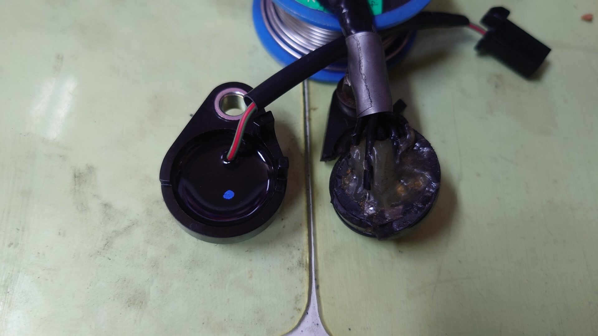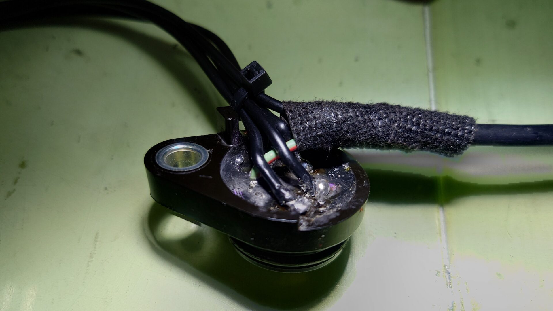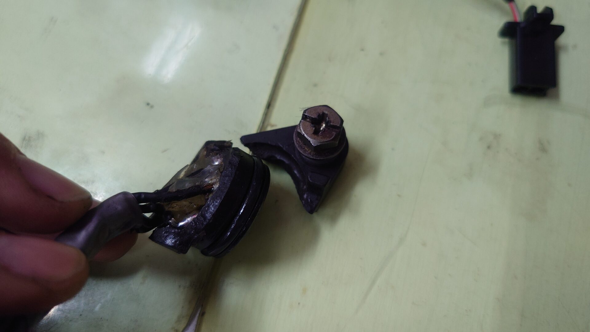今までのものが1速を感知しなくなったのはこの改造部分の接触不良であることは明白なのですが、画像の通りボルトで留める部分が割れていたり、改造部分も修正を重ねてグダグダになっていたりでこれ以上修理を繰り返しても次またすぐに不具合が発生しそうなので新品を発注しました。